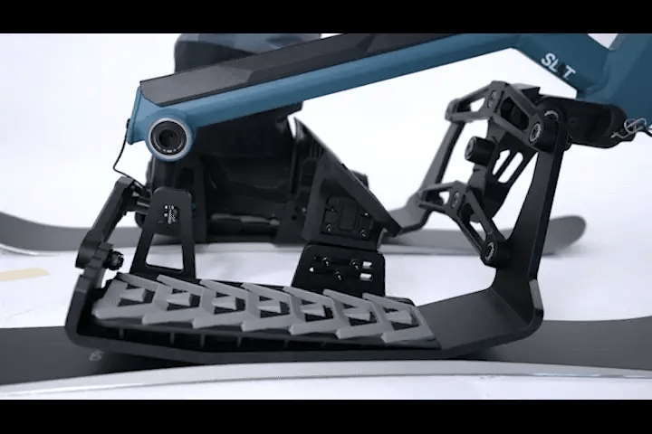 Levantá el esquí delantero extendiendo brazos y piernas. Cuando toque la plataforma, empujá la bici hacia adelante. Mirá hacia abajo para ubicar tus fijaciones, parate sobre las stomp pads (zonas antideslizantes) y empezá a deslizarte.